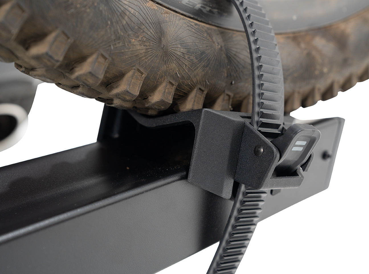 - StrongArm™ hook secures bikes at the front tire, with a flip-away rear wheel strap for quick loading/unloading